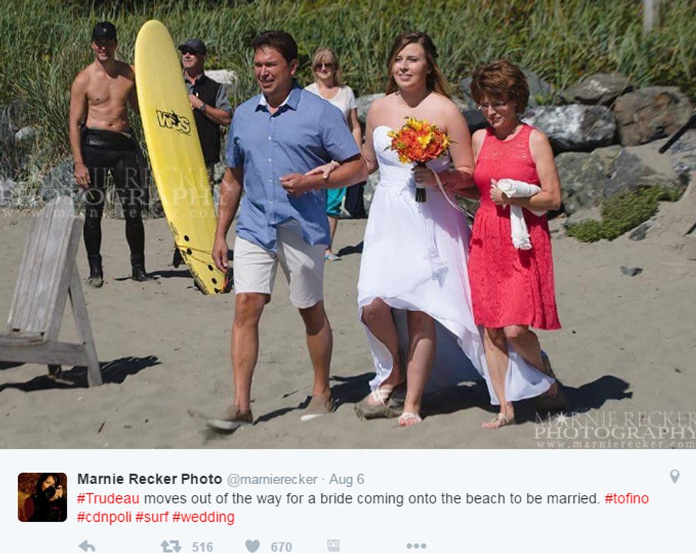 She says Trudeau was departing the beach when he realized he had stumbled into the path of a wedding procession, as the bride was walking down the aisle.