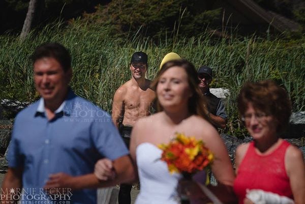 Wedding photographer Marnie Recker snapped a photo of the prime minister standing in the background just as the bride was making her way down the aisle.