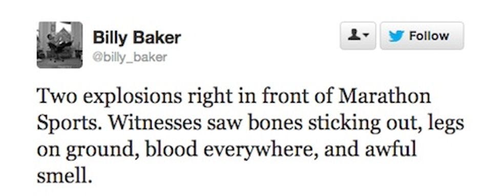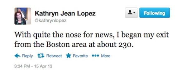 Gosh darnit, Kathryn-Jean Lopez left Boston just when "news" started happening. Don't worry, K-Lo, you still win the reporting award as usual for communicating the least amount of information about any given topic while still managing to make it all about yourself. What are we even talking about? Oh, right. There is a horrible tragedy unfolding in Boston. Two explosions went off near the Boston Marathon finish line. Holy shit.