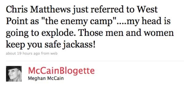 You have probably seen this like ten times by now, where Chris Matthews says Obama went into "the enemy camp" (the White Army) to deliver his speech last night. Shockingly, this pissed off no one more than National Review 's Kathryn Jean "Jonah Goldberg" Lopez, who declared this moment MSNBC's "new shameful low" and added, "Chris, he's commander-in-chief. " What is she THINKING! K-Lo,you're K-Lo.Hopefully the millions of hateful wingnut e-mails she's received for uttering this lie will straighten her out. Meanwhile, Meghan McCain had a different reaction.