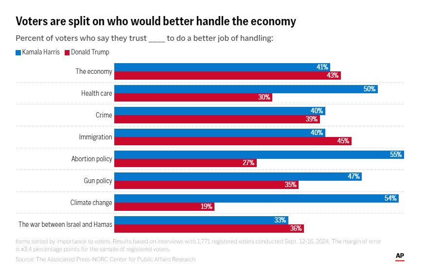 A new AP-NORC poll released Friday has good but kind of frustrating news for Kamala Harris: After months of polling showing registered voters think Donald Trump would be better at handling the economy than Joe Biden or Harris — yes, that Donald Trump! — the new poll, taken after Harris shellacked Trump in their only debate, shows that
