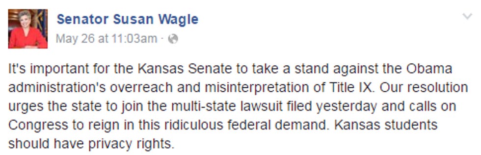 Kansas students will have a lot of privacy if they all have to pee at home while they're being Not Educated At School, because Kansas Republicans like Susan Wagle are paste-eating dumbfucks.