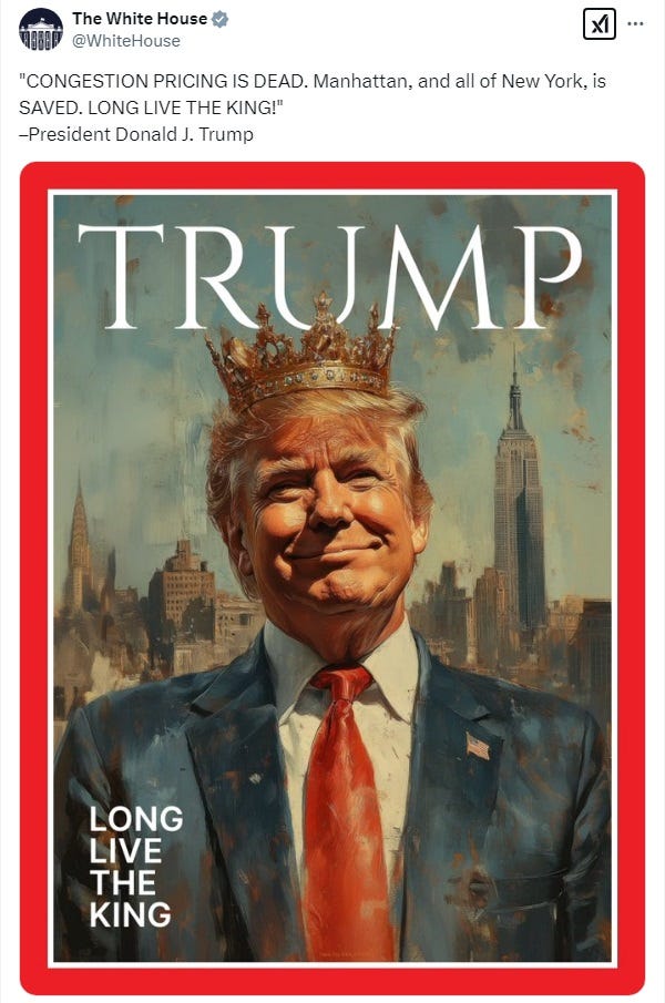 As we mentioned, Donald Trump cares not for mere trivialities like “the law,” because HE AM THE LAW, didn’t you hear him? So he had the White House tweet out a great big picture of him in a crown, no doubt made by one of his drooling fans using AI, we don’t care, with his message of liberation to New Yorkers who were sick and tired of shorter commute times and less traffic, exactly as congestion pricing had promised.