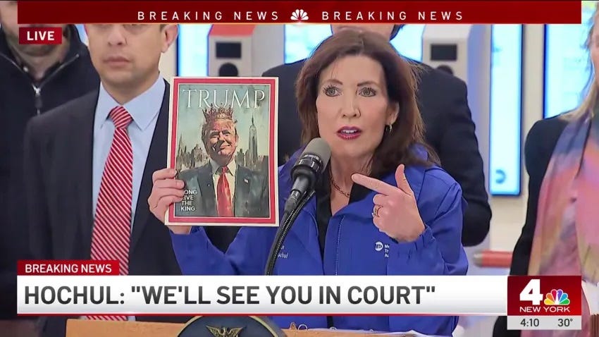Hochul arranged a presser at Grand Central Station to tell Trump that this tyranny will not stand, man, and then she lit into him with a full barrage of anti-monarchical rhetoric that would do Thomas Paine proud. Or maybe Spy magazine, we dunno.
