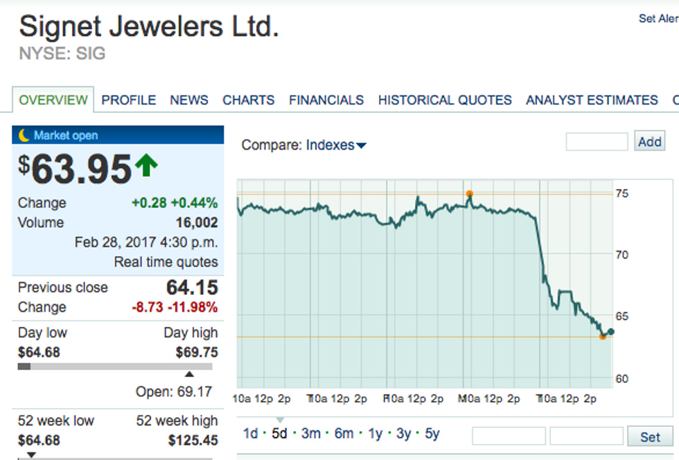 The plaintiffs are specifically seeking to recover back pay for employees underpaid or not promoted because of their gender. Their testimony paints a vivid picture of 1500 stores run like Mad Men's Sterling Cooper, where women were routinely pressured to sleep with their managers to gain promotions. Because arbitration is confidential, lawyers for the women only succeeded in releasing this testimony to the public on Sunday. The story was widely reported Monday, and on Tuesday Signet's stock price dropped so dramatically that trading was briefly halted.