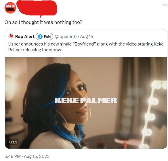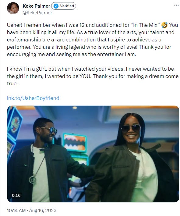 But if these men took two seconds to watch it, they’d see that Keke Palmer was not playing a prize to be won or a video vixen but rather a Rule 63 Usher … like the Big Boss she is.