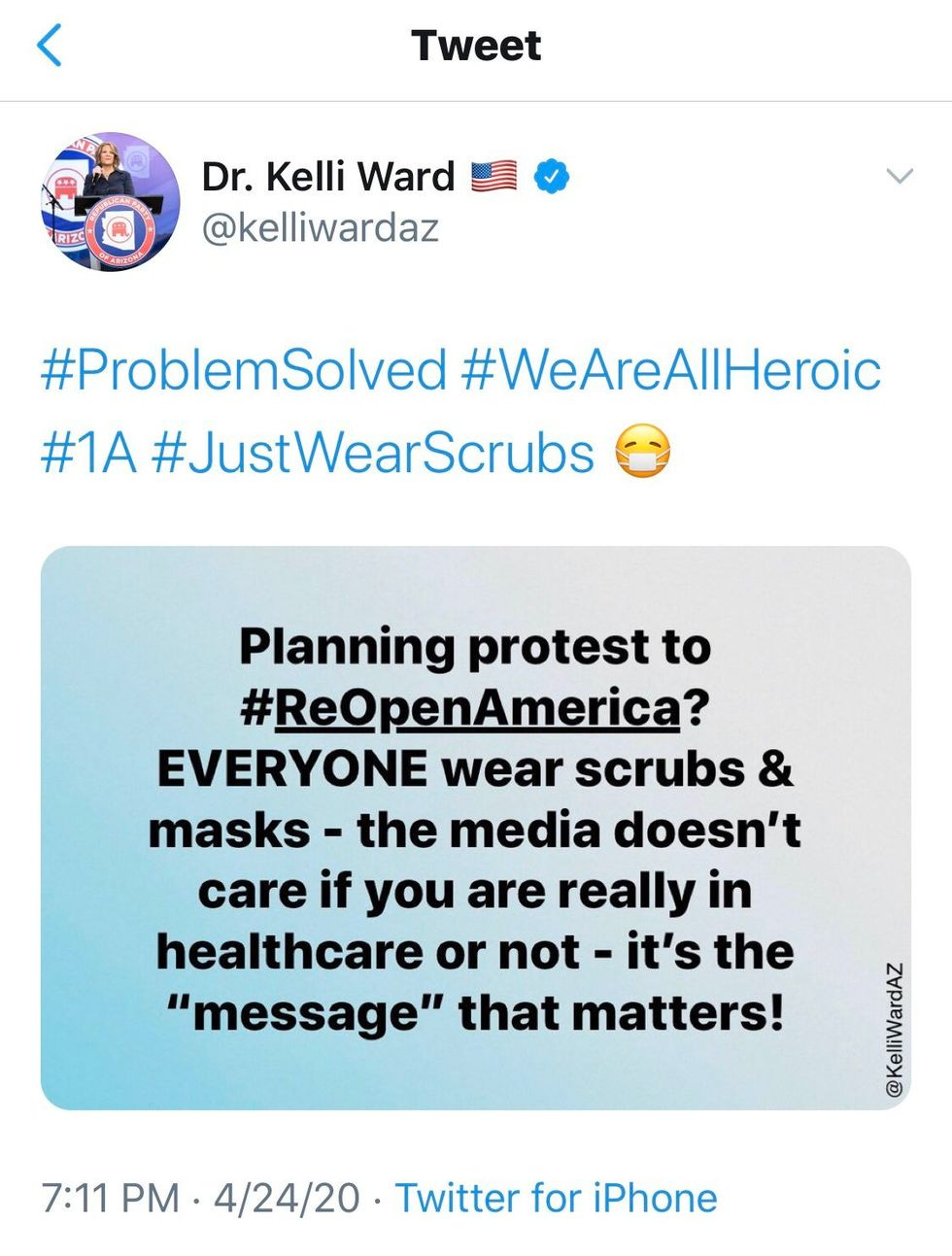 On Friday, Kelli Ward, the ever-kooky chairwoman of the Republican Party of Arizona, tweeted out a suggestion that people wear scrubs to their local ReOpen America rallies in hopes of making their stupid position appear more valid to the media, who will then assume the scrubs people are "heroes" without even checking to make sure they are actually medical workers.