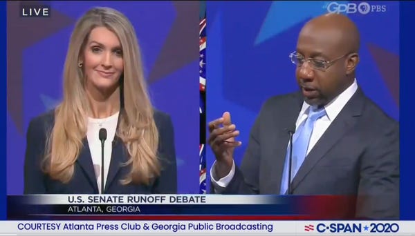 Sunday was Senate debate night down in Georgia. David Perdue was a no show, so Jon Ossoff answered questions next to an empty podium — no, really. He lucked out. Raphael Warnock was stuck debating Kelly Loeffler, who makes an empty podium look warm and inviting.