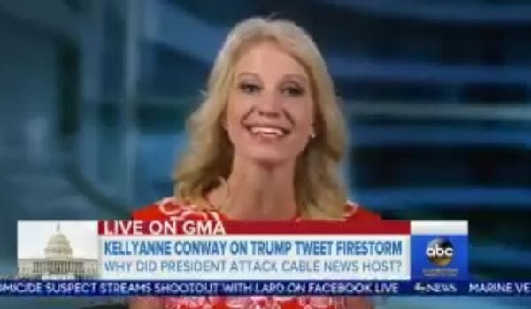 Kellyanne Conway had a thing or two to straighten out with George Stephanopoulos on Good Morning America today, especially how the liberal media have cheapened our political discourse and done a disservice to America's Lady Women by paying attention to all the weird stuff Donald Trump tweets instead of informing the ladies, on morning shows like GMA, about how tax cuts for the wealthy and slashing health insurance for 22 million will benefit ladies and their families.