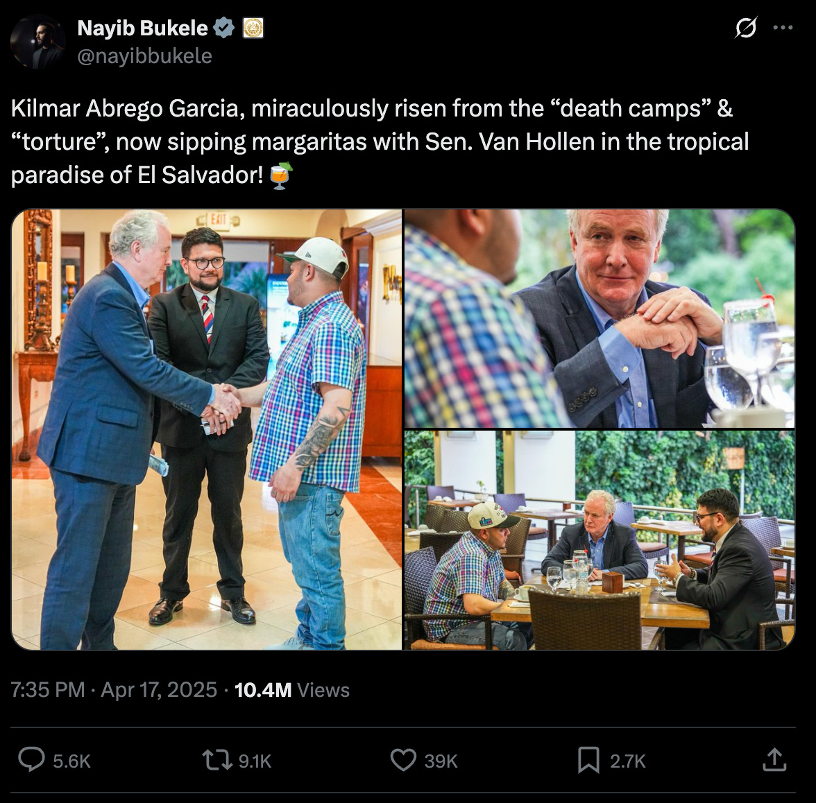 Bukele is running around Twitter like a fucking incel, retweeting posts that declare how they totally OWNED the libs and the Democrats, by showing that Abrego Garcia isn’t being mistreated, and now they have a picture of Chris Van Hollen with an MS-13!