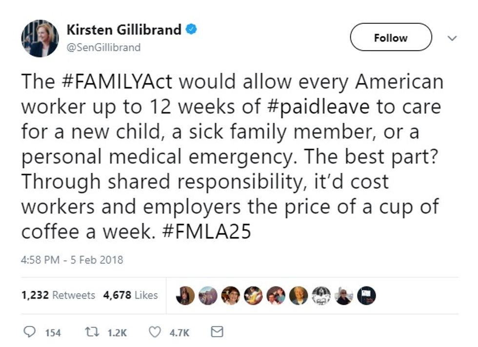That would be the Family And Medical Insurance Leave (FAMILY) Act, which Gillibrand has introduced every year for the last five years, with Rosa DeLauro backing a paired version in the House. It's actually a fairly simple proposal: Like Medicaid and Social Security, it would be paid for by modest deductions from every paycheck and available to all wage-earners, regardless of income. The tax would be two cents per $10 of income; under $1.50 a week for typical workers. Yeah, we know, you were really excited about that big tax cut Paul Ryan gave you, but don't worry, this would be worth it.