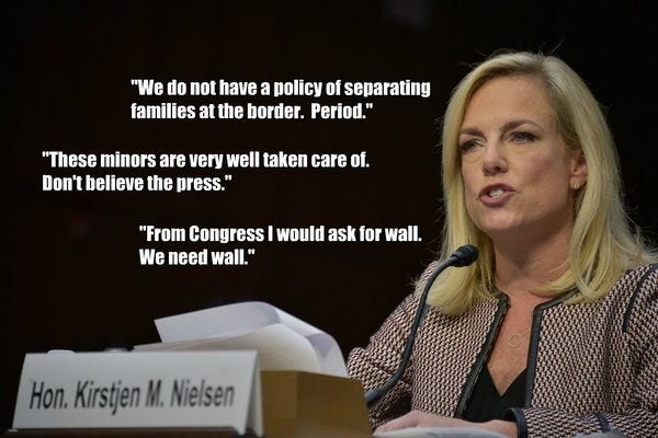 Nielsen also notoriously presided over DHS when the administration rolled out its family separation policy last April. The policy was pushed by her former boss John Kelly long before it became official, and as we later learned, thousands of children might have been taken away from parents before the policy was announced. Kelly readily acknowledged he thought taking children away from their parents was a nifty "deterrent" to people seeking asylum. Nielsen, on the other hand, was shocked, shocked that anyone thought there was such a policy, because there wasn't.