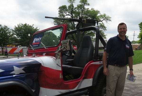 Kobach, cannily throwing some red meat to Republican primary voters, attended the Old Shawnee Days parade standing in the back of a flag-patterned Jeep next to a replica of a .50-caliber machine gun, because a gaudy vehicle without a gun wouldn't make it clear he was also honoring veterans, you see. But mostly the Second Amendment, and the right of all American to defend themselves, as Kobach pointed out in his completely spontaneous post-parade tweet, which very subtly brings up the issue: