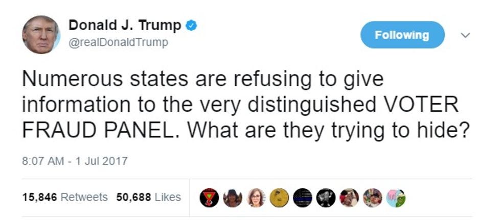 Now, here's where things get sticky for states facing Kobach's request: Refusing to comply at all is probably the best choice, because the commission doesn't have subpoena power, and the more states that tell Kobach to go jump in a nearby body of water, the better, even if they risk a pissy tweet from that man in the White House: