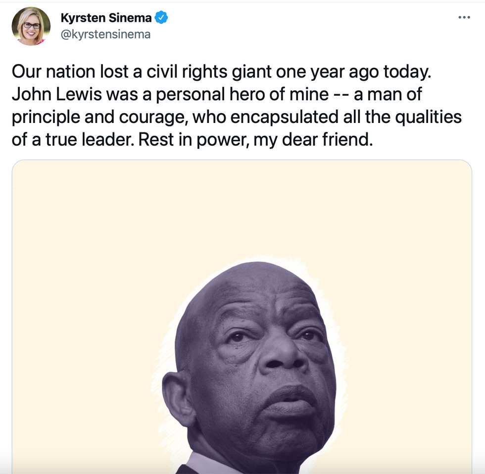 Kyrsten Sinema is nothing like John Lewis, but she was shameless enough to elevate herself by standing on his shoulders, even in death. Behold the whiteness: