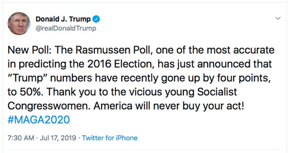 FiveThirtyEight gives Rasmussen Reports a C+ -- just like the grades Trump bought at a discount for his kids. The Vicious Young Socialist Congresswomen, however, is an A+ name for an alternative rock band from the 1990s. We could see them opening for L7 at Lollapalooza. Trump definitely makes it on their shit list.