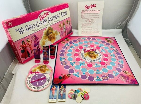 When I was a kid, my neighbor had the Barbie "We Girls Can Do Anything" Game, pictured above. While my fear of developing unrealistic expectations of women's bodies (Thanks, Mom!) and belief that all dolls were probably haunted would not allow me to play with Barbie dolls, the board game was my compromise position. I liked board games. This one showed girls they could have just about any job in the whole world, so long as it was in some way conducive to wearing a pink evening gown.