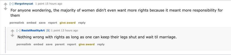 "For anyone wondering," explained user iforgotmycat, "the marjority of women didn't even want more rights because it meant more responsibility for them."