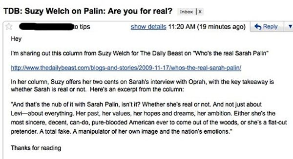 This e-mail made us sad. "In her column, Suzy offers her two cents on Sarah's interview with Oprah, with the key takeaway is whether Sarah is real or not." This "Suzy" sounds like a keeper, HEHNGNN?