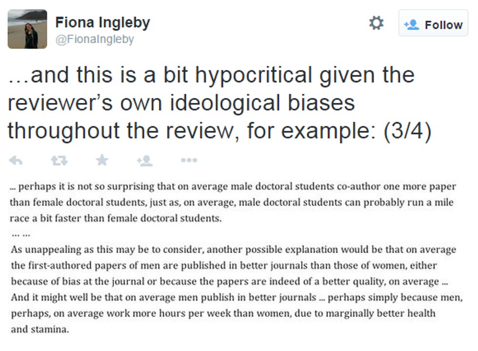 Yes, your eyes are not fooling you, that says that “[i]t would probably … be beneficial to find one or two male biologists to work with (or at least obtain internal peer review from, but better yet as active co-authors)” to keep those ladies from “drifting too far away from empirical evidence into ideologically biased assumptions." Also, a whole bunch of shit about how ladies just suck at writing papers, and don't get published in good journals -- definitely not because there's systemic sexism in the scientific community, of course! -- and can't even run as fast as boys.