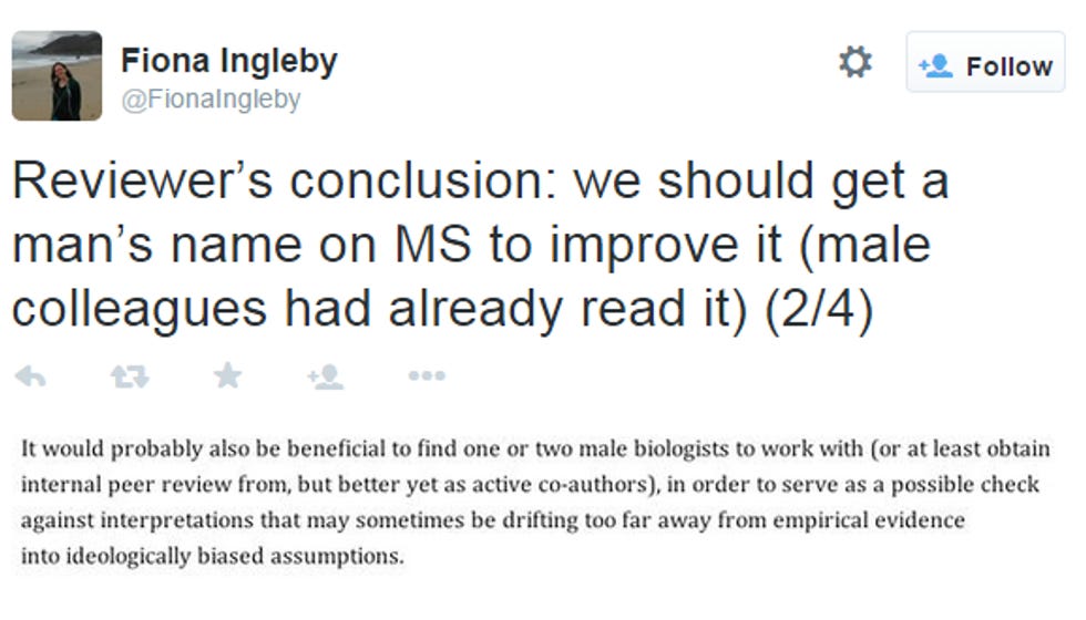 Here is some proof that sexism is still a thing, in case you had forgotten all about it. Two lady biologists submitted a paper for peer review, which is that thing scientists do to make sure they've done their science good. The reviewer had but one critique: this paper would be a hell of a lot better if some dudes did it. That was really the only criticism! University of Sussex researcher Fiona Ingleby was very surprised to hear this, and posted itall over Twitter, LIKE LADIES DO: