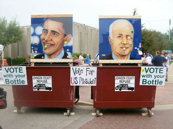 A Wonkette Refuse Desposal Spy sends us this snap taken while biking through beautiful Lisbon, Iowa recently during the RAGBRAI, which is Iowan for "bicycle ride." Bikers and volunteers were asked to vote for president by throwing stuff in the dumpster for the earnest young Egyptian man or the sinister one-eyed albino villain. The fellow on the left won by a three-to-one margin, which is why Barack Obama is President of Iowa. [ City of Lisbon ]