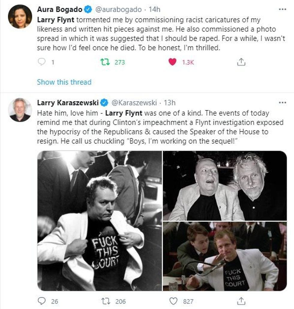 The news of Flynt's death was met with a diversity of opinions, as this actual random pair of tweets illustrates: