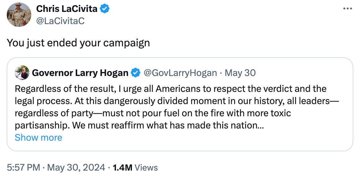 Seems it’s been a lousy week for Maryland Republican US Senate hopeful Larry Hogan, and we are here for it. He went to his first-ever Pride parade in Annapolis and got booed, heckled, and had “MY BODY MY CHOICE” screamed at him (and also got plenty of hugs, TBF). He Twaddered about his love for Ronald Reagan, who has been dead for 20 years. And he urged everyone to “respect the verdict” before Trump got served those 34 felony guilties, a message that could also have been directed at ANTIFA had the verdict gone the other way, but put him in the crossed butthairs of the Trump campaign.