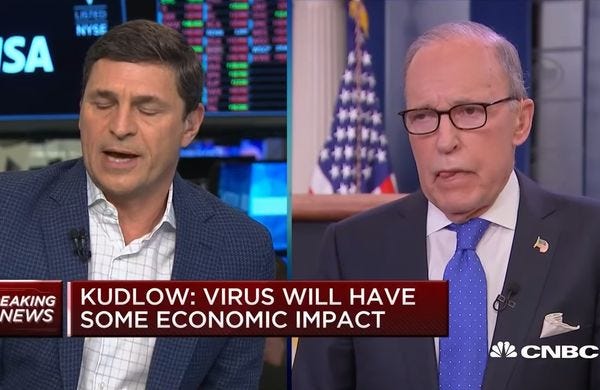 Host David Faber broke in, with some squawking, and noted that former FDA commissioner Scott Gottlieb had warned (like, on Faber's show the other day) that the US response to the outbreak has been inadequate, and we're "losing valuable time" in getting measures in place to prevent larger outbreaks. Gottlieb also noted that because of inadequate testing , there are likely thousands of undetected cases, though Faber didn't bring that up with Kudlow.