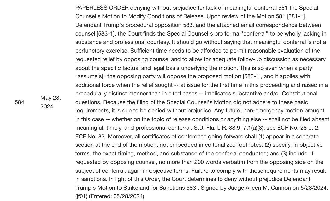 Cannon denied the motion because Smith’s lawyers didn’t discuss it adequately/nicely with Trump’s lawyers before filing it — this is called “conferral” — therefore she found Smith’s motion “wholly lacking in substance and professional courtesy.”