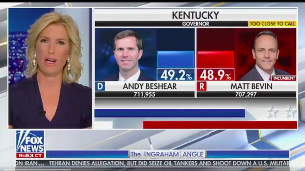 Laura Ingraham was the only Fox News host to devote much (or really any) time to last night's election results, and boy was it a master class in bonkers. Now, she's flashed us some full frontal crazy before. She crowedlast year that Andrew Gillum and Stacey Abrams losing their races in Florida and Georgia proved that Donald Trump won the midterms. But the Democrats actually "lost" those races. Democrat Andy Beshar straight-up wonthe Kentucky governor's race. That is not in any way good news for Republicans.