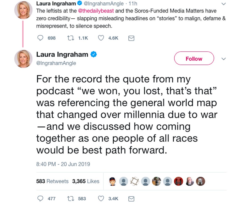 The resulting backlash was so great Ingraham tried to pretend she didn't say what she actually said. She did this last year when she was so racist David Duke sent her a signed set of fitted white sheets and a hood.