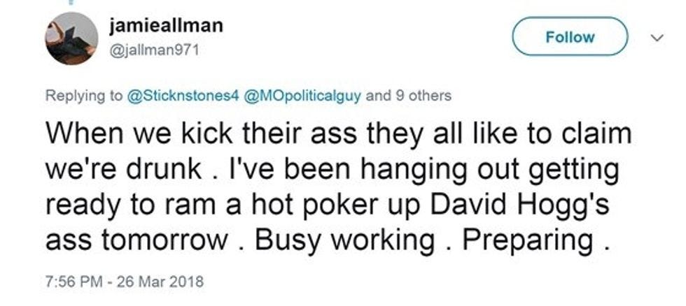We've already tweeted our own suggestion to Ms. Ingraham that she profile Mr. Allman on "Defending The First," because after all, just like Kevin Williamson, Allman may have suggested something horrific, but he was certainly speaking for a sizeable portion of the conservative audience. Heck, unlike Williamson, Allman could even make the claim that he meant that metaphorically, so we certainly hope Ingraham will have Allman on her show to explain why an innocent, probably not literal, call for shoving a red-hot poker up a teenage boy's ass is a valuable contribution to America's ongoing dialogue about guns, and about the liberals who have silenced him. Unless she doesn't really believe in complete free speech, of course.