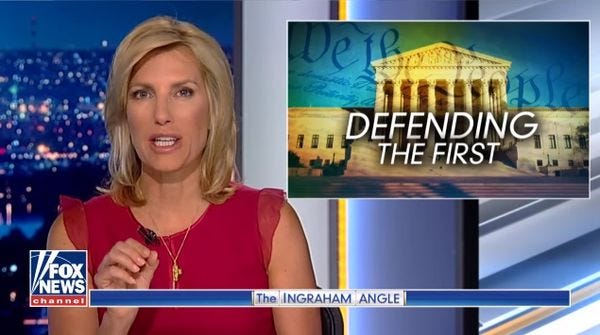 Ingraham closed her show with an exciting announcement about a brand new feature of her show: "Defending the First," in which she will do something that no one else out there is doing: defend the First Amendment, which is under attack by leftist Stalinist mobs. Suck it, ACLU! She's going to expose and call attention to those who would destroy America (leftists) just for making them a little uncomfortable: