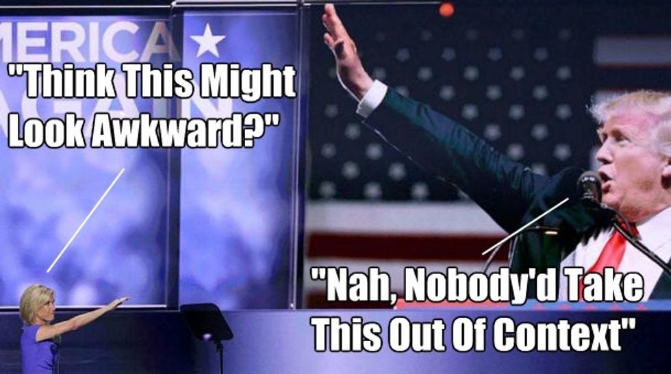 Laura Ingraham's RNC speech Wednesday got tons of attention for her awkward wave/salute thing that looked a hell of a lot like a brief Nazi salute, which was immediately captured and memed all over the interwebs by the viral gif service Giphy. It didn't help a hell of a lot that it was paired on the big monitor in the arena with an image of Donald Trump waving back, as captured by Getty Images and fair-use parodied here: