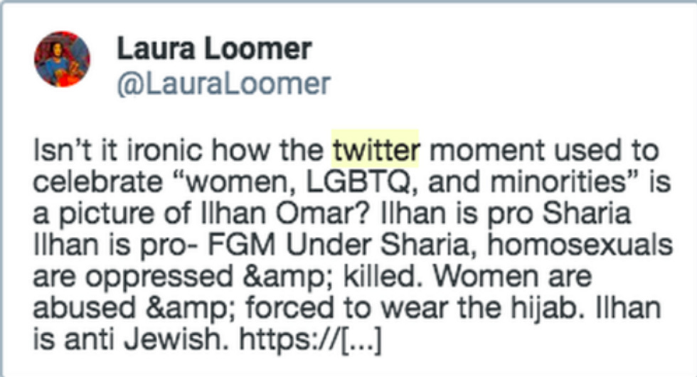 In Loomer's mind, as she explains it in this bizarre two hour rant, she was banned from Twitter for bravely speaking out against an elected official who loves female genital mutilation, hates Jewish people and wants to institute Sharia law in the United States.