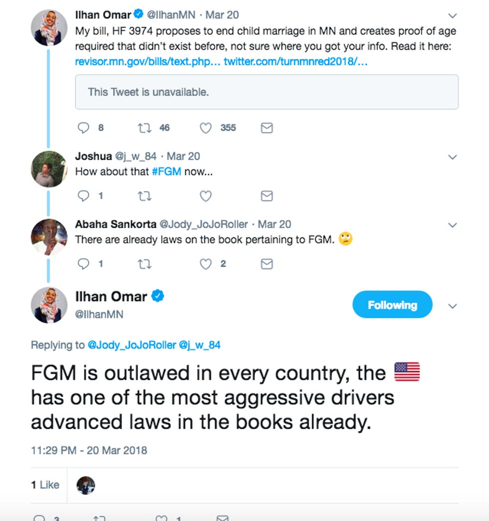 In real life, she was spouting a bunch of Islamaphobic nonsense. Ilhan Omar does not think female genital mutilation should be legal, she just understands that it is already illegal . You can't get mad at someone for not proposing a law to make something illegal when it is already illegal.