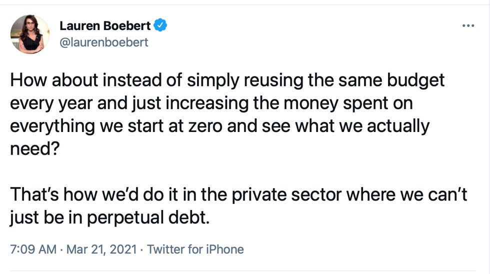 This "debt BAD!" rhetoric is so goddamn tiresome. Boebert's private sector experience involves running Shooters Grill in Rifle, Colorado, where the wait staff carries guns like it's the old West. That's a little different from the federal government. As people smarter than Boebert — so, like, almost everyone — quickly pointed out, the federal government employs as many people as Walmart, and that corporation's CFO doesn't zero out its budget every year. That would be really dumb.