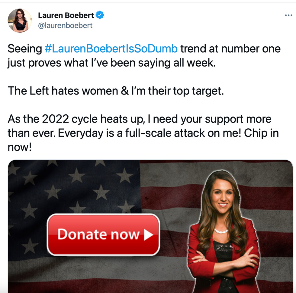 Boebert complained: “Seeing #LaurenBoebertIsSoDumb trend at number one just proves what I've been saying all week. The Left hates women and I'm their top target."