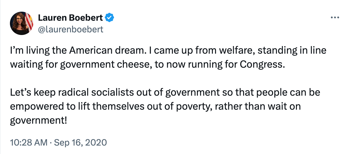 As it turns out, Boebert is easy to be sympathetic to, if you’re an irredeemably bleeding-heart-liberal type. Her backstory is pretty damn dark. Her mother Shawna Bentz had her at the age of 18 in Altamonte Springs, Florida, and still doesn’t know who Lauren’s father is even after a DNA test, which points to some extremely grim conceptual circumstances. Or some Jesusy ones! “Bentz remembers telling her daughter. ‘Jesus is the only father you need.’” Which also happens to be the plot of Stephen King’s “Carrie.”