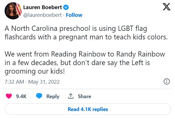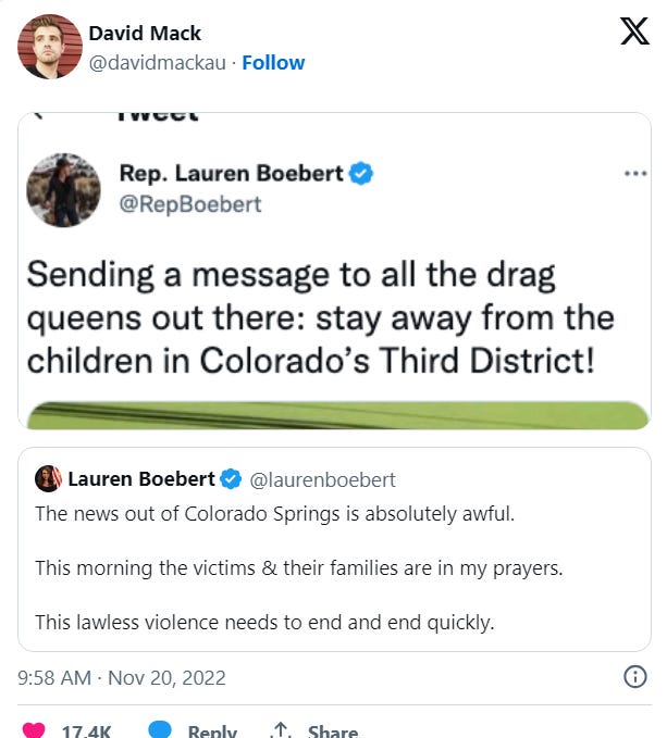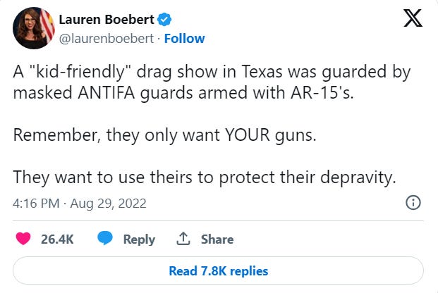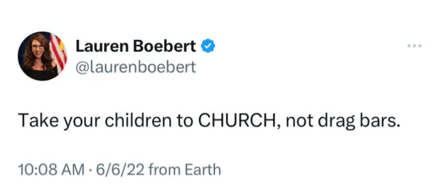 When Boebert pulled the typical fundamentalist white Christian move and responded to the Colorado Springs mass shooting with meaningless thoughts and prayers, another tweet from Boebert was quoted, where she said, “Sending a message to all the drag queens out there: stay away from the children in Colorado’s Third District!”