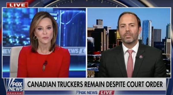 Anchor Anita Vogel reminded Gooden that the truckers’ “protests” were "only adding now to the supply chain issues which affect inflation,” but Gooden still delivered a pro-blockade message. He also tweeted Saturday, "Fines of $79,000. Jail time of up to a year. Suspension of commercial licenses. The way Canada is threatening Freedom Convoy truckers should serve as a warning for Americans.”