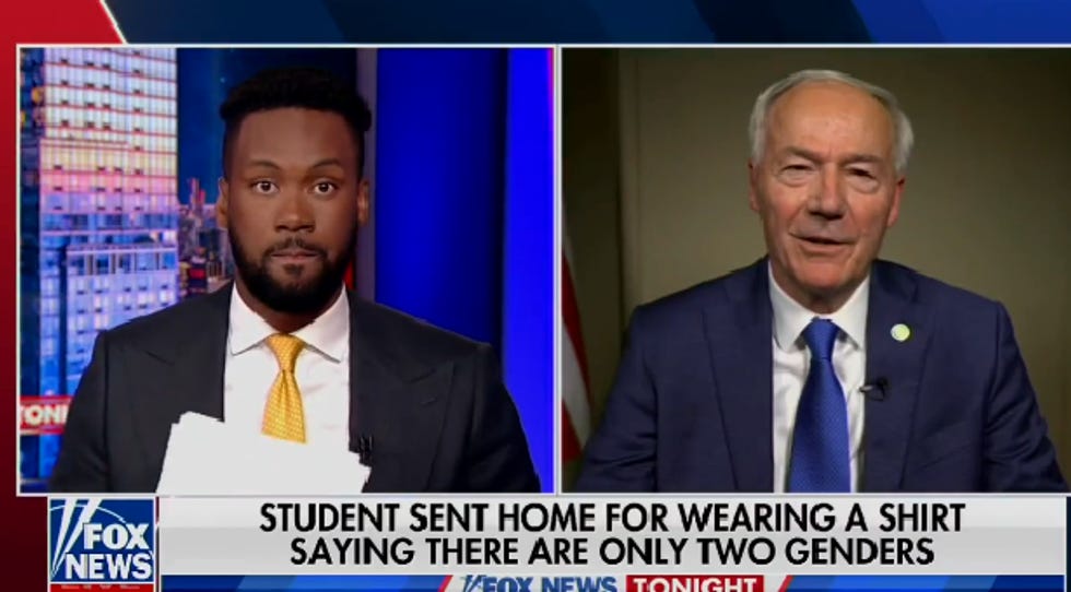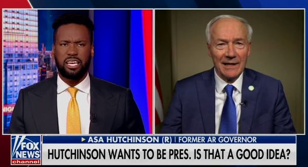 Jones interviewed Republican presidential candidate (LOL) and former Arkansas Governor Asa Hutchinson, and for some reason he thought his job was just to be as mean as possible. There is no reason for a Fox News host to be mean to Hutchinson right now. He is a threat to no one's presidential prospects. Not Donald Trump's, not Ron DeSantis's. Hell, during Tucker's last week of employment, he was interviewing every certified bugfuck presidential candidate he could find, like Robert F. Kennedy Jr. and Larry Elder.