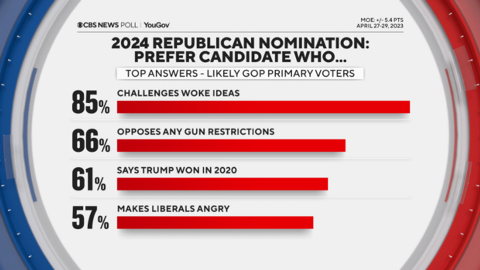 Eighty-five percent want a candidate who "challenges woke ideas." Sixty-six percent want someone who "opposes any gun restrictions." Sixty-one percent for "says Trump won in 2020."