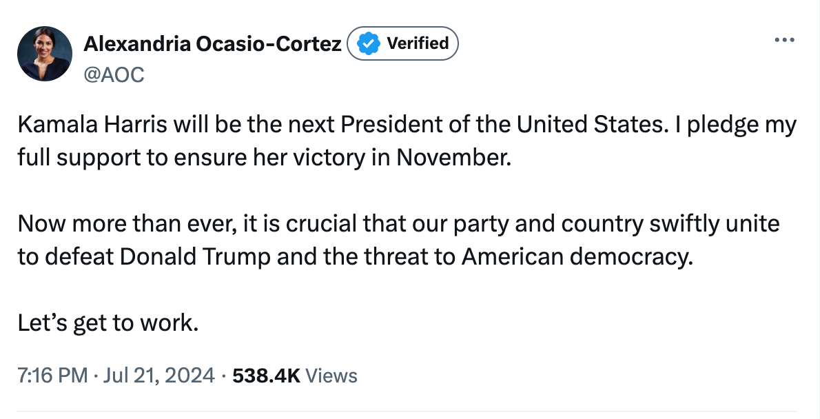 “Kamala Harris will be the next President of the United States. I pledge my full support to ensure her victory in November,”AOC wrote on social media. “Now more than ever, it is crucial that our party and country swiftly unite to defeat Donald Trump and the threat to American democracy. Let’s get to work.”