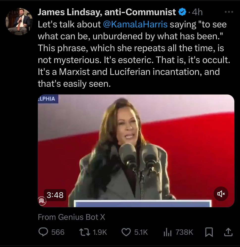 “Let's talk about saying ‘to see what can be, unburdened by what has been,’ he wrote on social media. “This phrase, which she repeats all the time, is not mysterious. It's esoteric. That is, it's occult. It's a Marxist and Luciferian incantation, and that's easily seen.”