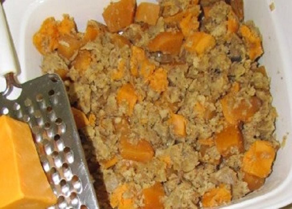 Put the stuffing in the casserole in big chunks. Mix in the "plus a little more" of cheese.