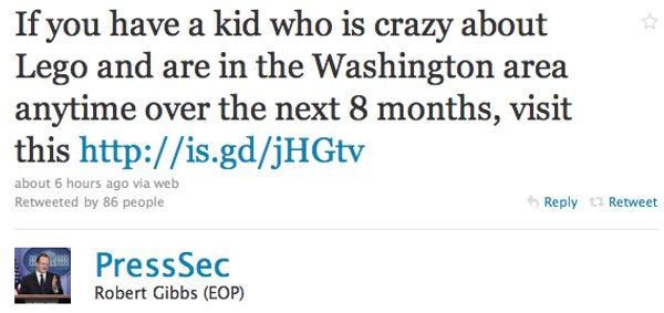 The man will stop at nothing until he has destroyed every building in D.C. made out of children's plastic bricks. And now he's radicalizing young, disaffected adherents of Twitter. [ Twitter ]