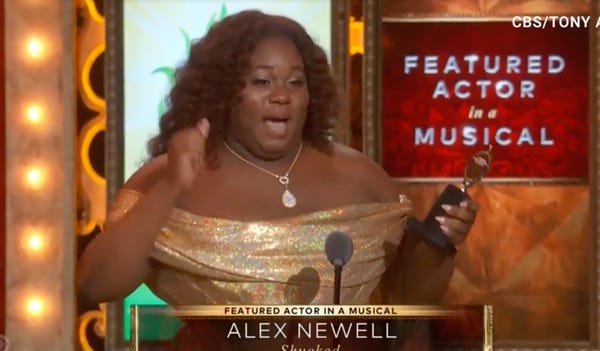 "I have wanted this my entire life," Newell said during their acceptance speech. "Thank you for seeing me, Broadway. I should not be up here as a queer, nonbinary, fat, Black little baby from Massachusetts."