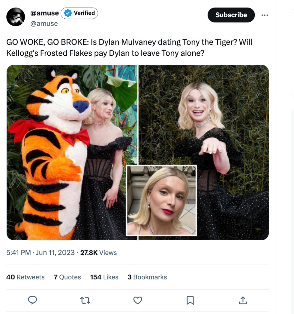 As part of a marketing gimmick, a Tony the Tiger mascot did a whole bit where he walked the red carpet and handed out participation bowls of cereal to those who didn't win their categories. However, while doing this bit, the mascot took some cute pictures with trans influencer Dylan Mulvaney and now the Right is furiously throwing boxes of Frosted Flakes out their windows, because that's what they do now.